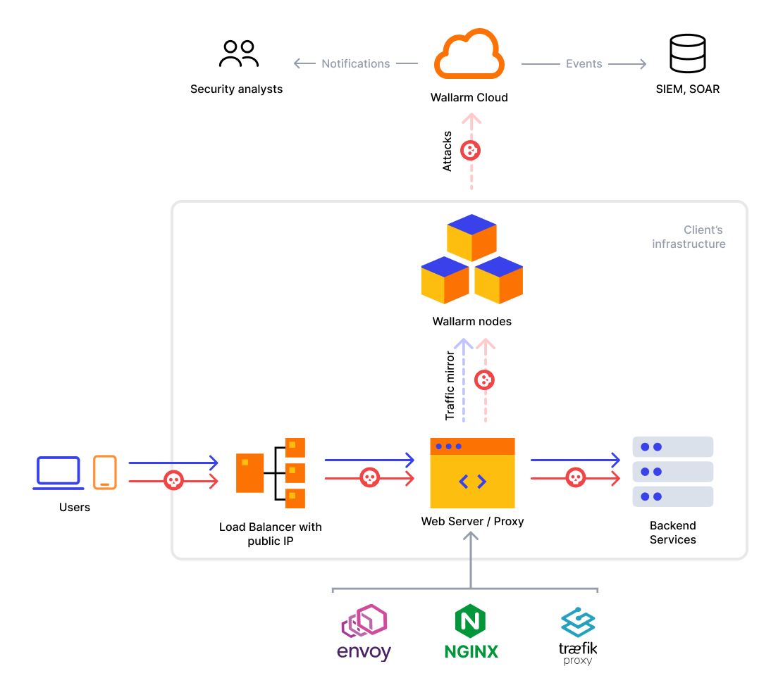 Belowe are the examples on how to configure NGINX, Envoy, Traefik, Istio to mirror incoming traffic to Wallarm nodes as to an additional backend.