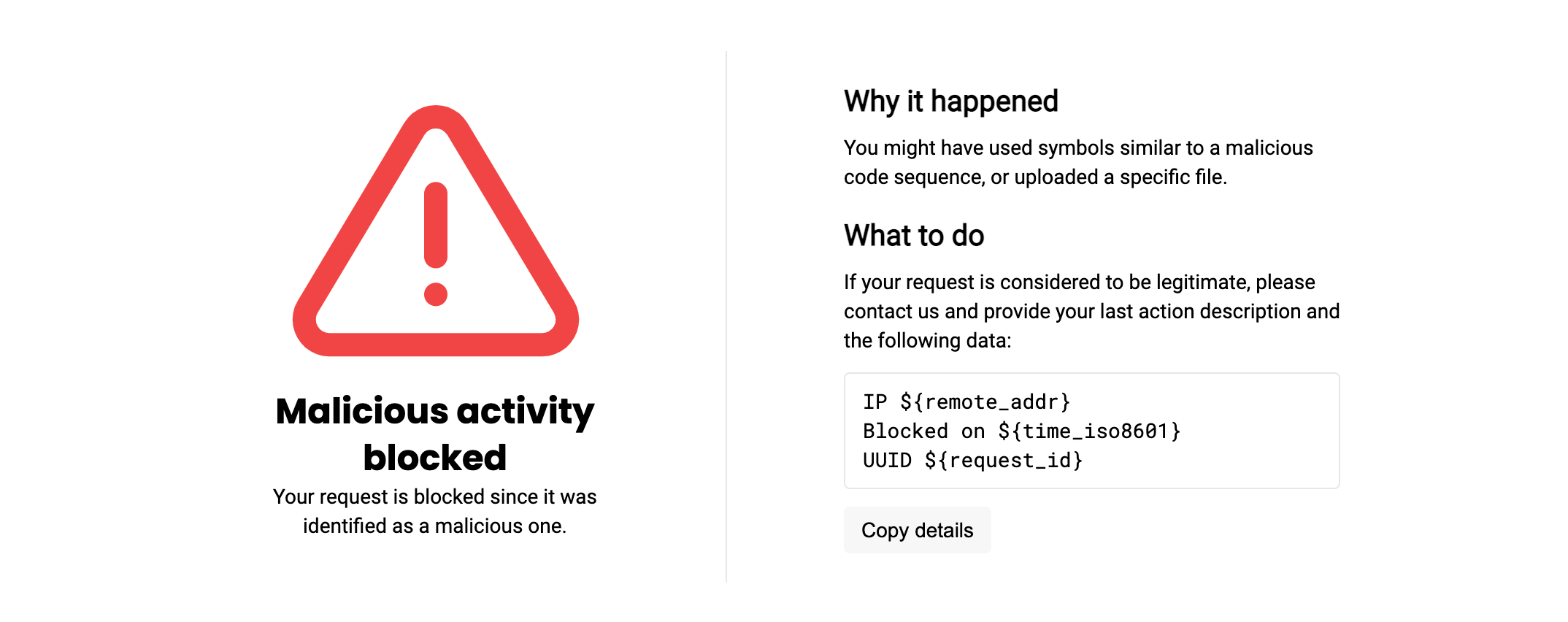 These instructions describe the method to customize the blocking page and error code returned in the response to blocked requests. The configuration is only relevant for the self-hosted NGINX Nodes.