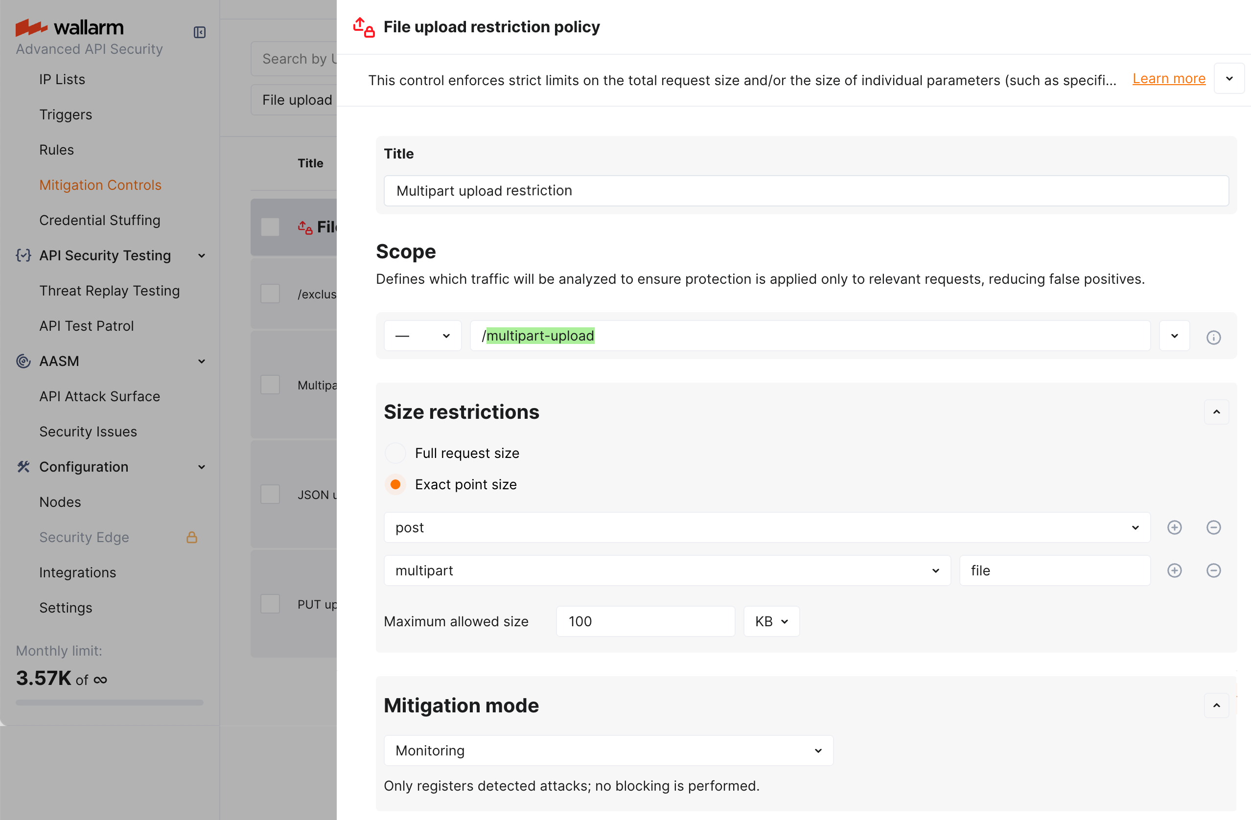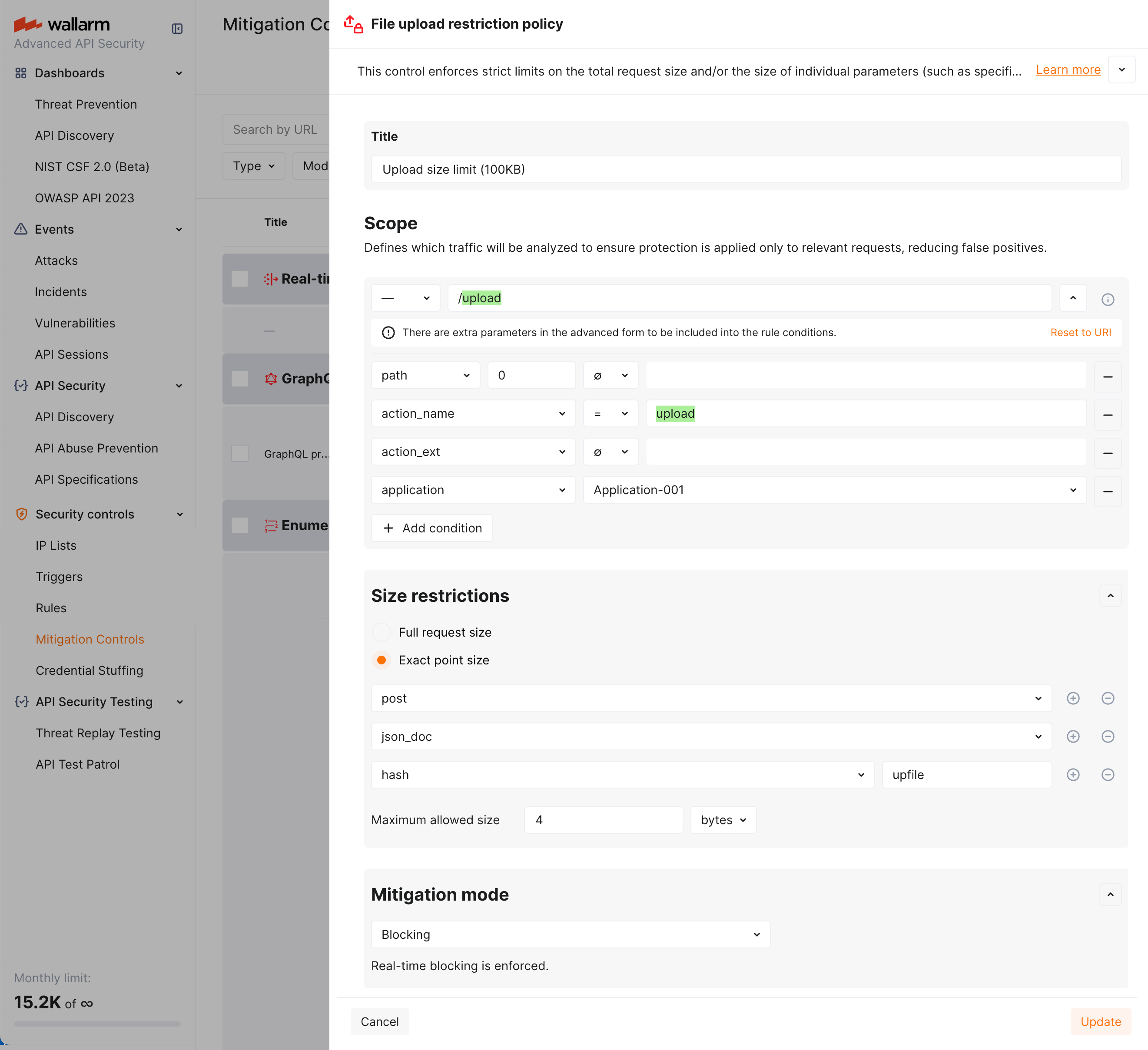 As a part of Advanced API Security subscription, Wallarm provides the File upload restriction policy mitigation control.