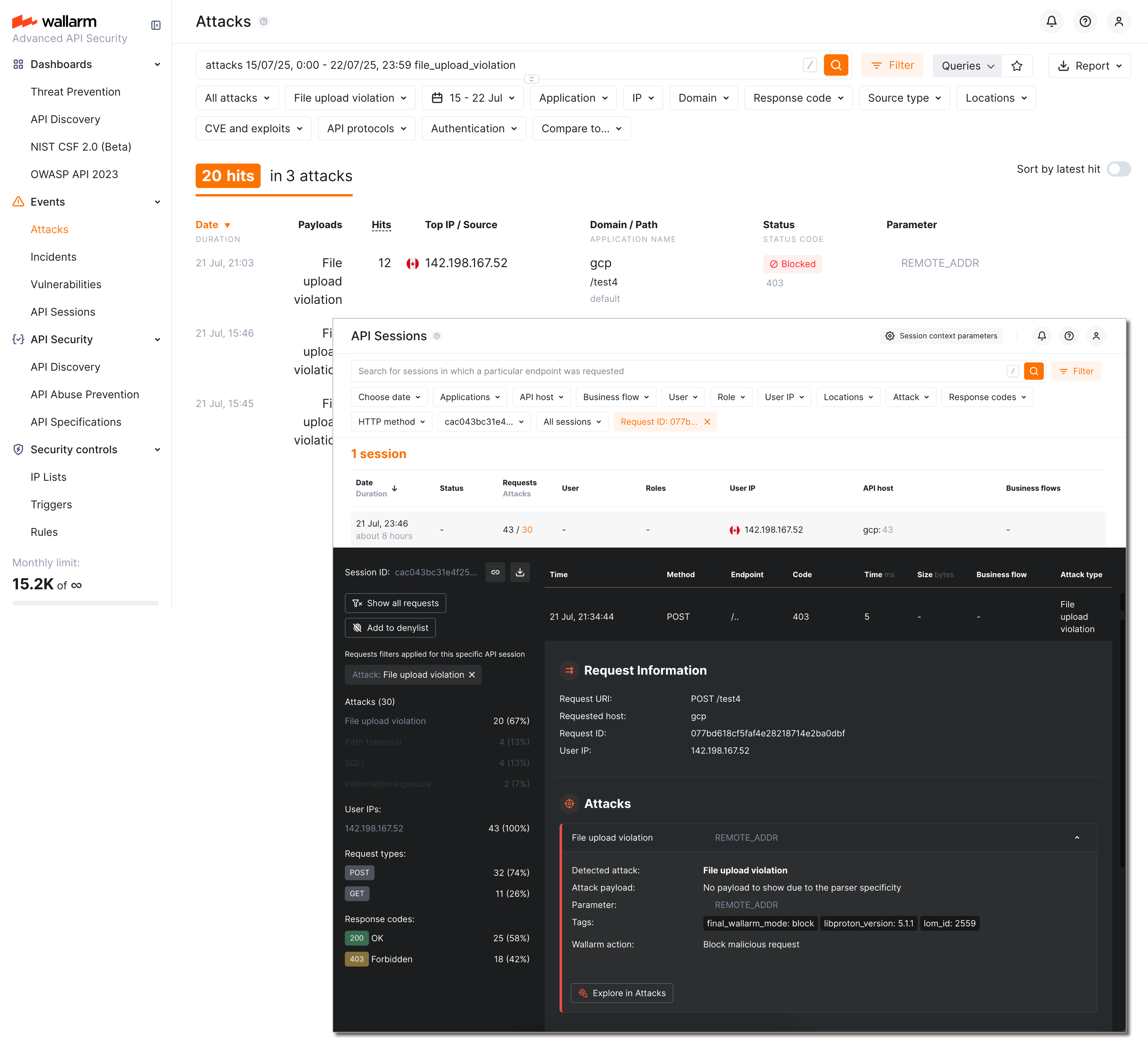 You can switch between Attacks and API Sessions views using buttons in request details. All the attacks/sessions with this attack type can be found with the attack type filter set to File upload violation (also, use file_upload_violation search tag in Attacks).