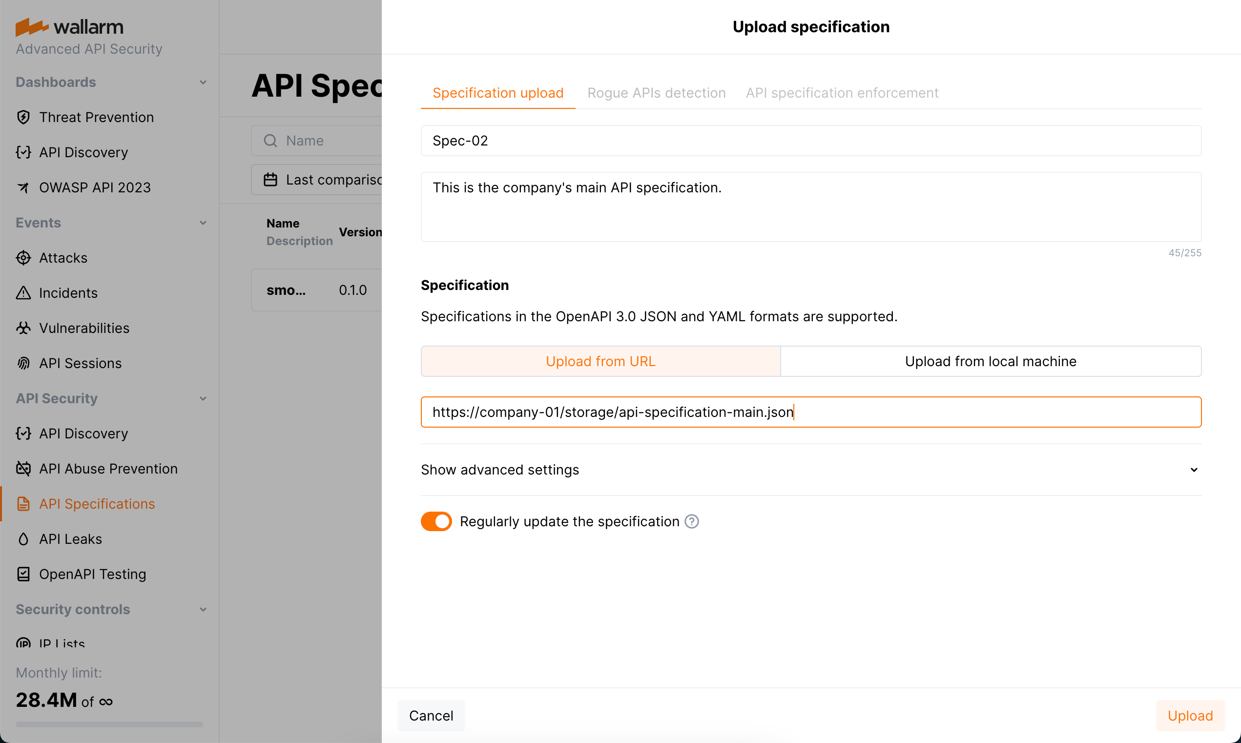 Specification file is checked for correspondence to the API specification syntax, and if not valid, is not uploaded. Note that you will not be able to start configuring API specification enforcement, until the specification file is successfully uploaded.