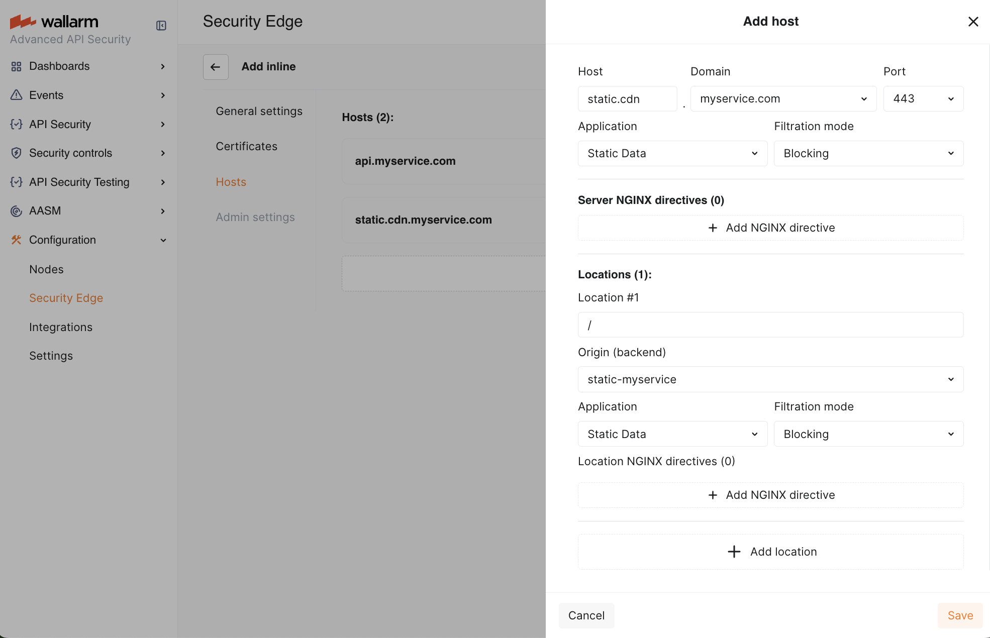 /):- Origin where the Wallarm Node will forward the filtered traffic (if no other location-specific settings are defined). The location's path is automatically appended to the origin.