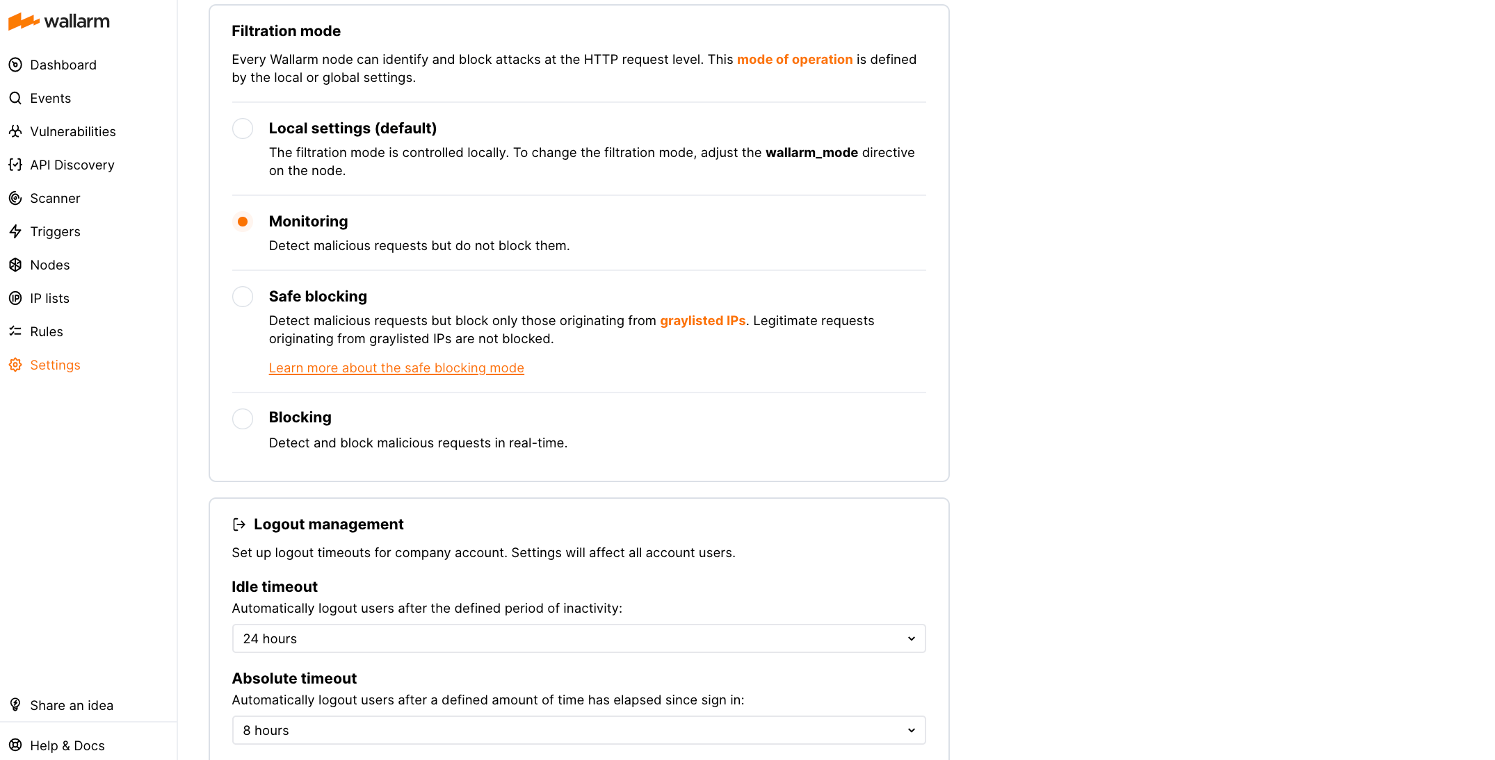 Invite your team members to your Wallarm account and assign each one a specific role to safeguard sensitive information and limit account actions. Manage users under Settings → Users.
